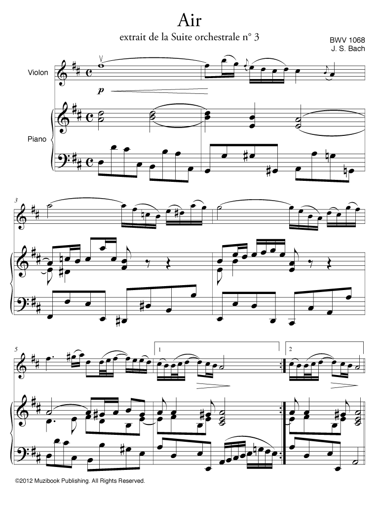 Air on the G String from Suite No. 3 by Johann Sebastian Bach. Transcribed for violin and piano. Including separate violin part. Intermediate. MCL47